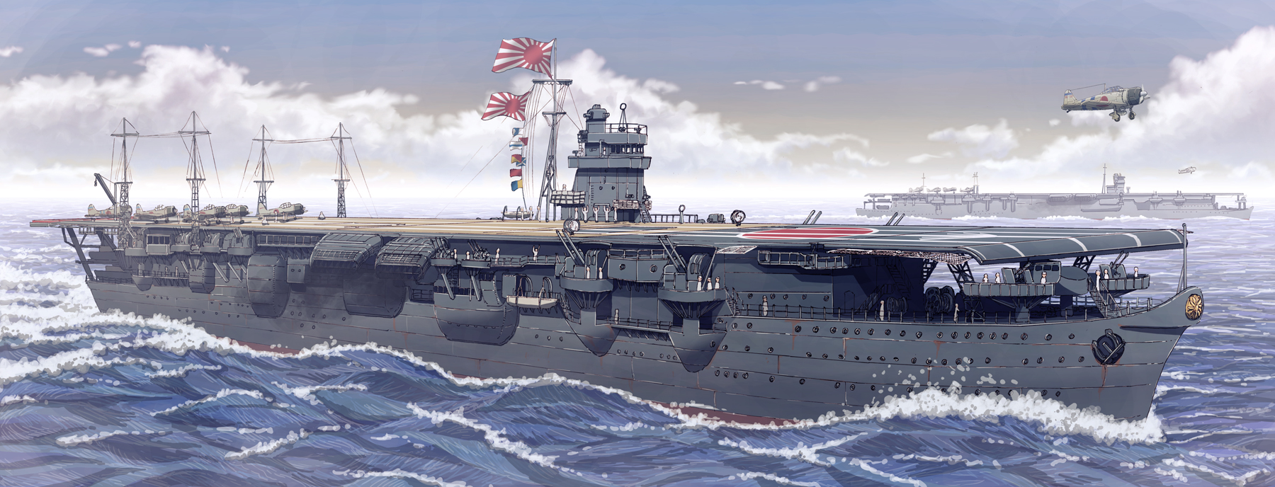 6+boys a6m_zero aircraft aircraft_carrier airplane anti-aircraft anti-aircraft_gun blue_sky bomb cannon cloud day earasensha explosive flag gun highres hiryuu_(aircraft_carrier) imperial_japanese_navy machine_gun male_focus military military_vehicle multiple_boys ocean original propeller_fighter real_life ship ship_turret sky souryuu_(aircraft_carrier) takeoff warship water watercraft weapon