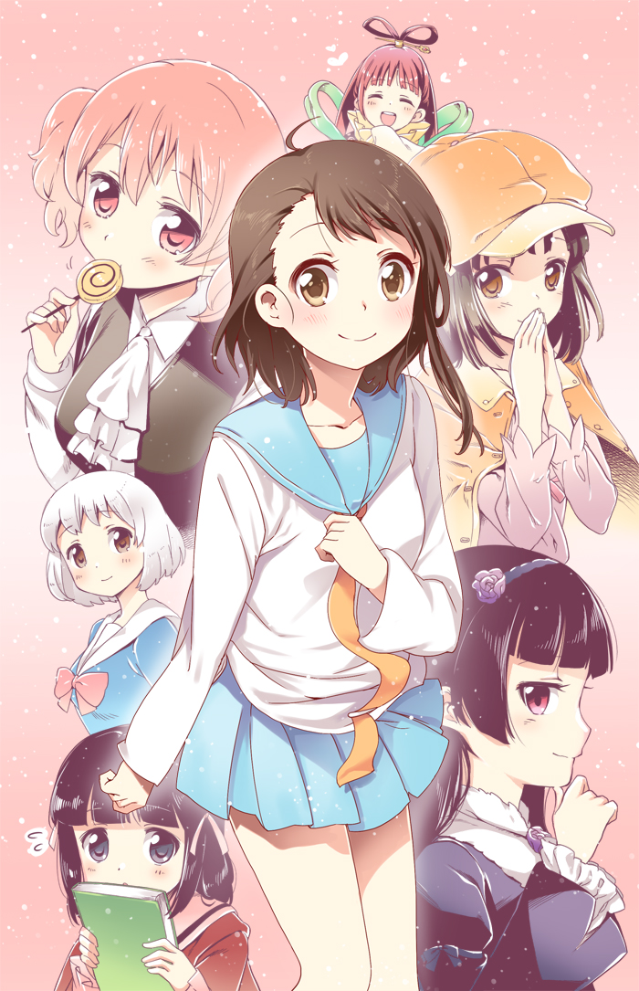 10s 6+girls :d ^_^ ahoge bakemonogatari black_hair blush book bow brown_eyes brown_hair newsboy_cap candy closed_eyes crossover flower flying_sweatdrops food gokou_ruri gothic_lolita gradient_background hair_ornament hair_ribbon hairband hanazawa_kana hat heart holding holding_book inu_x_boku_ss kami_nomi_zo_shiru_sekai light_smile lolita_fashion lollipop long_hair long_sleeves looking_at_viewer magi_the_labyrinth_of_magic mitsuki_meia monogatari_(series) multiple_crossover multiple_girls neckerchief necktie nisekoi onodera_kosaki open_mouth ore_no_imouto_ga_konna_ni_kawaii_wake_ga_nai own_hands_together pink_background pink_hair pleated_skirt profile purple_flower purple_rose red_hair ren_kougyoku ribbon roromiya_karuta rose school_uniform sengoku_nadeko serafuku serva shiomiya_shiori short_hair skirt smile tonari_no_seki-kun twintails voice_actor_connection white_hair yokoi_rumi