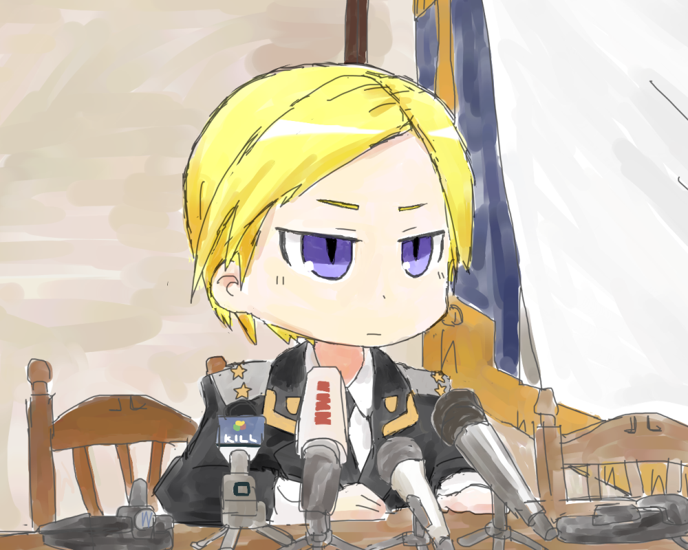 1girl air_diver_(f119) blonde_hair female_focus kill_me_baby microphone military military_dress_uniform military_uniform natalia_poklonskaya necktie parody purple_eyes real_life russia russian_text short_hair solo sonya_(kill_me_baby) twintails