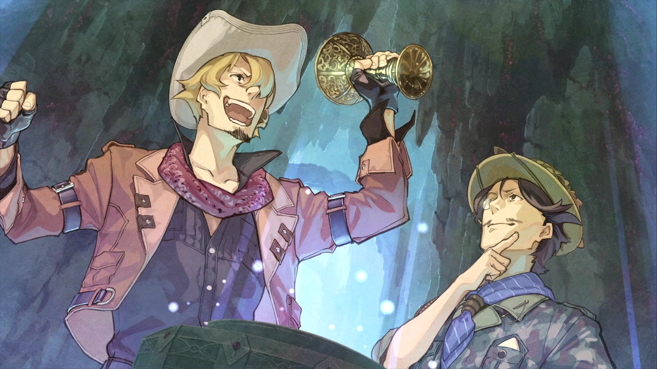 10s 2boys arm_belt atelier_(series) atelier_escha_&_logy black_gloves black_hair blonde_hair camouflage chalice clenched_hand collarbone cowboy_hat cup dutch_angle facial_hair fingerless_gloves game_cg gloves goatee hair_over_one_eye harry_olson hat hidari_(left_side) holding jacket male_focus monocle multiple_boys mustache official_art open_mouth reyfer_luckberry