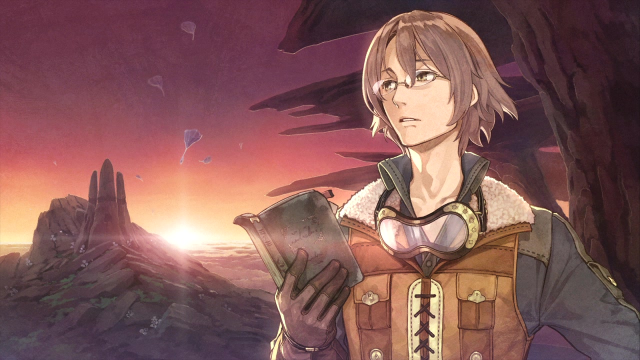 10s 1boy atelier_(series) atelier_escha_&_logy awin_sidelet book brown_eyes brown_gloves brown_hair game_cg glasses gloves goggles goggles_around_neck hidari_(left_side) holding holding_book male_focus official_art open_book outdoors parted_lips rimless_eyewear short_hair solo sun sunrise sunset upper_body vest