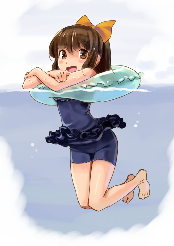 1girl bad_source barefoot blue_one-piece_swimsuit blush bow brown_eyes brown_hair character_request copyright_request female_focus floating frilled_swimsuit frills full_body hair_bow hair_ornament innertube katahira_masashi looking_at_viewer nontraditional_school_swimsuit one-piece_swimsuit open_mouth orange_bow partially_submerged ponytail school_swimsuit short_hair smile solo swim_ring swimsuit toes water