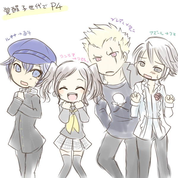 2boys 2girls 793_(artist) blonde_hair blue_hair brady_(fire_emblem) cosplay cynthia_(fire_emblem) fire_emblem fire_emblem_awakening gakuran inigo_(fire_emblem) kujikawa_rise kujikawa_rise_(cosplay) kuma_(human)_(persona_4) kuma_(persona_4) kuma_(persona_4)_(cosplay) lucina_(fire_emblem) megami_tensei multiple_boys multiple_girls nintendo persona persona_4 scar school_uniform serafuku shin_megami_tensei shirogane_naoto shirogane_naoto_(cosplay) silver_hair smile sweatdrop tatsumi_kanji tatsumi_kanji_(cosplay) thighhighs twintails