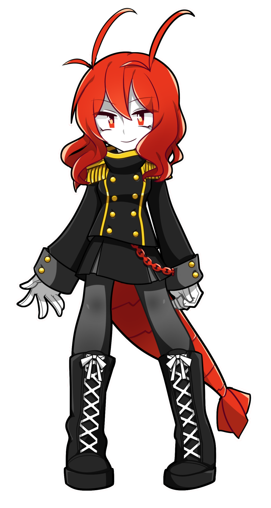 1girl antenna_hair aya_(terrainakka) ayane_wakana bad_id bad_pixiv_id black_boots boots chain colored_skin epaulettes female_focus full_body funamusea gloves highres lobco long_hair oounabara_to_wadanohara pantyhose red_eyes red_hair skirt solo tail transparent_background white_skin
