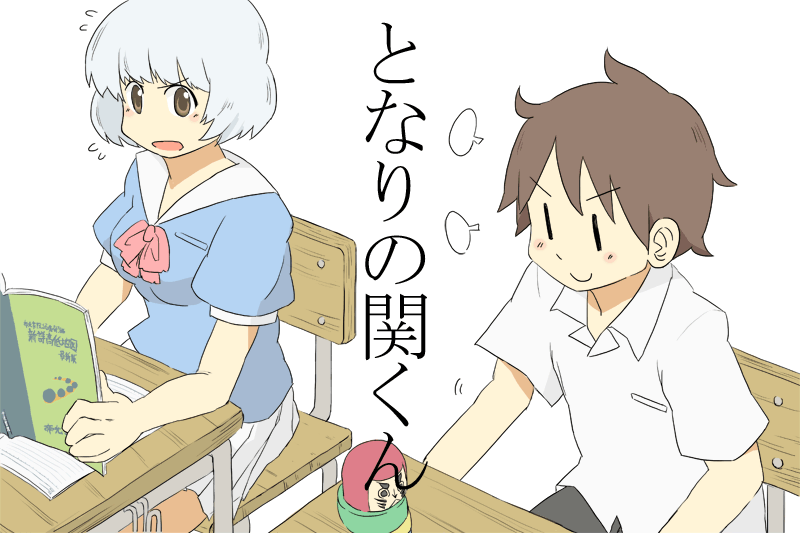 1boy 1girl black_hair blush_stickers bob_cut book brown_eyes brown_hair concentrating copyright_name desk flying_sweatdrops furrowed_brow imaha_sastsuki looking_to_the_side nichijou open_book open_mouth parody reading school_desk school_uniform seki_toshinari short_hair silver_hair simple_background style_parody sweatdrop tokisadame_school_uniform tonari_no_seki-kun toy white_background yokoi_rumi