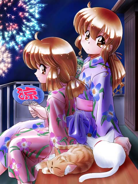 2girls aerial_fireworks cat fireworks hand_fan japanese_clothes kimono multiple_girls original paper_fan siblings sisters sitting sunset uchiwa yukata zan