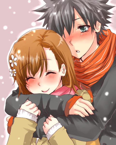 1boy 1girl black_hair blue_eyes blush brown_hair closed_eyes flower hair_flower hair_ornament happy hetero hug hug_from_behind kamijou_touma melorythm misaka_mikoto scarf short_hair smile toaru_kagaku_no_railgun toaru_majutsu_no_index