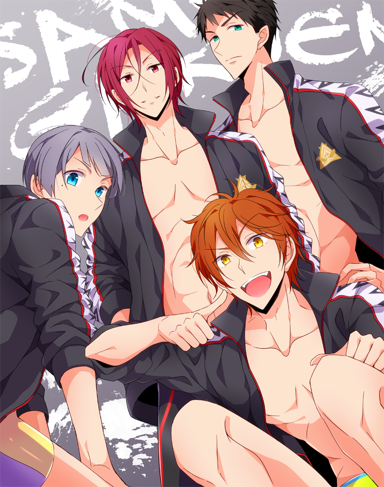 10s 4boys aqua_eyes bad_id bad_pixiv_id black_hair blue_eyes free! grey_hair iincho_(airi8751) jacket male_focus matsuoka_rin mikoshiba_momotarou mole mole_under_eye multiple_boys nitori_aiichirou open_mouth orange_hair red_eyes red_hair short_hair smile swimsuit yamazaki_sousuke