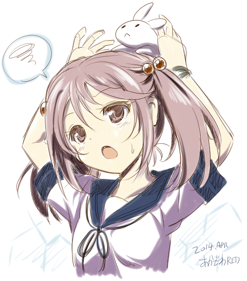 10s 1girl akazawa_red animal animal_on_head artist_name bad_id bad_pixiv_id dated female_focus hair_bobbles hair_ornament half_updo hand_up head_tilt kantai_collection on_head outstretched_arms pink_eyes pink_hair rabbit sazanami_(kancolle) school_uniform serafuku short_hair short_sleeves sketch solo spoken_squiggle squiggle sweatdrop tareme twintails upper_body white_background