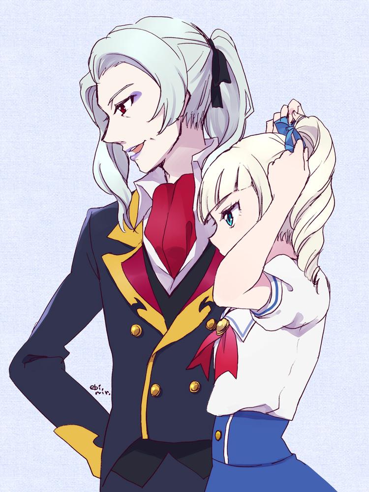 10s 1boy 1girl adjusting_hair aikatsu! aikatsu!_(series) aqua_eyes artist_name ascot blunt_bangs bow drill_hair eyeshadow fang formal_clothes from_side grey_hair hair_bow hair_ribbon height_difference ichimatsu_(niru) jacket lipstick long_hair makeup open_mouth ponytail profile puffy_short_sleeves puffy_sleeves red_eyes ribbon school_uniform short_sleeves signature simple_background skirt smile starlight_academy_school_uniform todo_yurika twin_drills twintails tying_hair white_hair yumekouji_maya