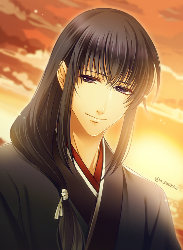 1boy bad_id bad_pixiv_id bakumatsu_shishi_no_renai_jijou bishounen black_hair blue_eyes e_sasaoka japanese_clothes long_hair male_focus smile solo sunset takechi_henpeita twitter_username