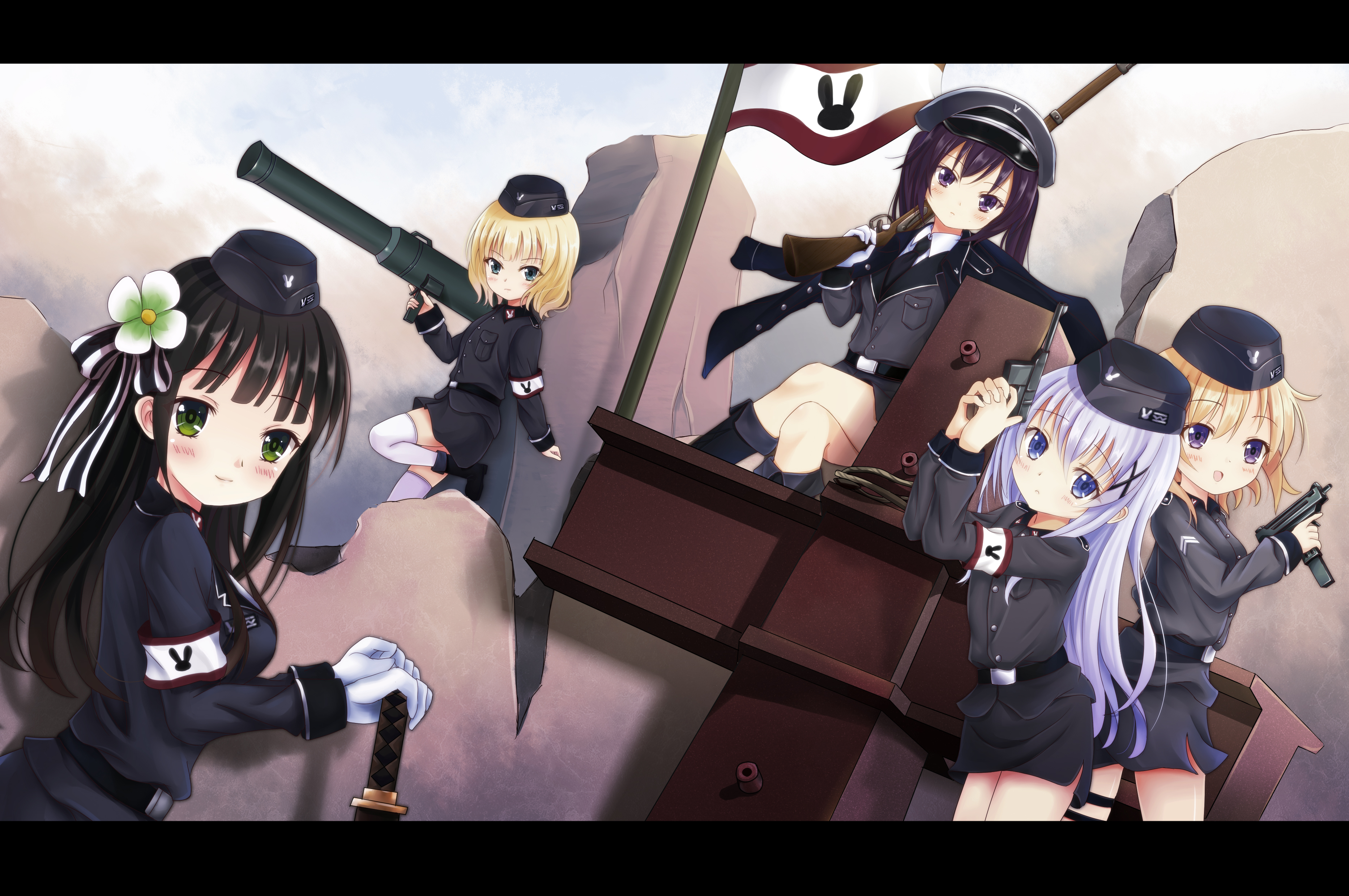 5girls absurdres armband black_hair blonde_hair blue_eyes blue_hair brown_hair flag flower garrison_cap gloves gochuumon_wa_usagi_desu_ka? green_eyes green_flower grey_hat guhua67 gun hair_flower hair_ornament hairclip handgun hat highres hoto_cocoa kafuu_chino kirima_syaro letterboxed long_hair looking_at_viewer machine_pistol military military_uniform multiple_girls necktie orange_hair peaked_cap pistol purple_eyes purple_hair ribbon rifle short_hair shotgun skirt sword tedeza_rize twintails two-tone_ribbon ujimatsu_chiya weapon x_hair_ornament