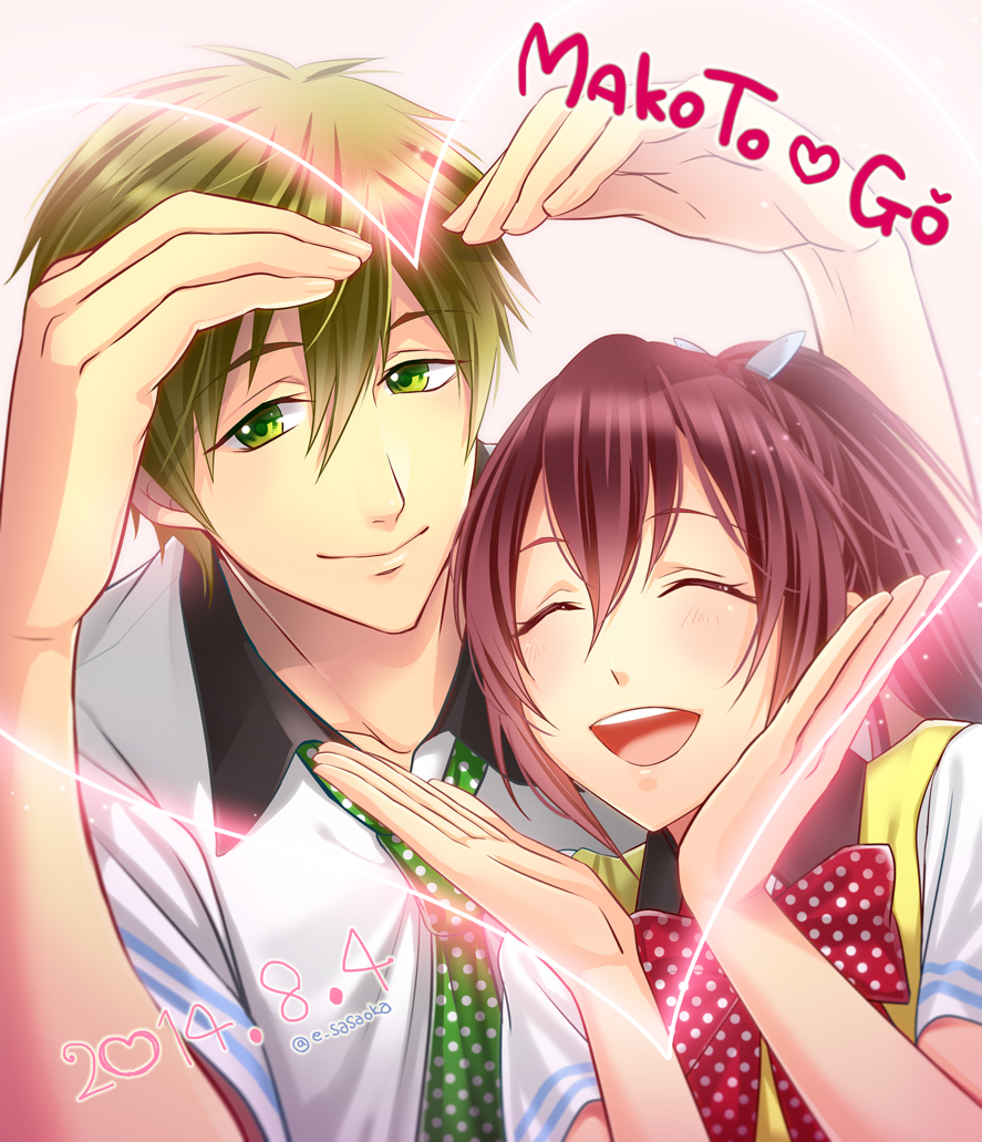 10s 1boy 1girl bad_id bad_pixiv_id blush brown_hair dated e_sasaoka closed_eyes free! green_eyes heart heart_hands heart_hands_duo long_hair matsuoka_gou ponytail red_hair school_uniform short_hair smile tachibana_makoto twitter_username
