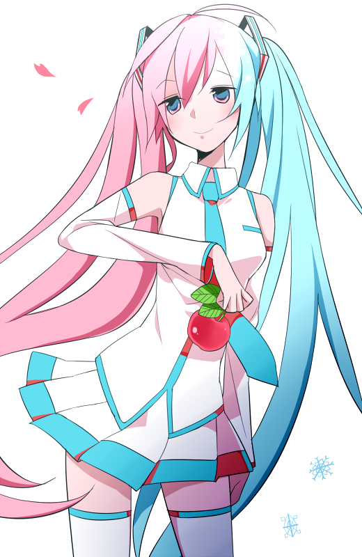 1girl apple aqua_hair blue_eyes cherry female_focus food fruit hatsune_miku long_hair multicolored_eyes multicolored_hair necktie pink_eyes pink_hair sakura_miku smile solo twintails tyobimiru very_long_hair vocaloid yuki_miku