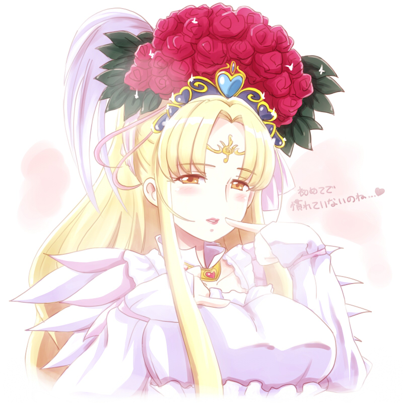 10s 1girl aphrodite_(precure) blonde_hair blue_crown blush brown_eyes circlet crown female_focus flower h26r hair_flower hair_ornament headdress long_hair precure red_flower red_rose rose solo suite_precure upper_body white_background