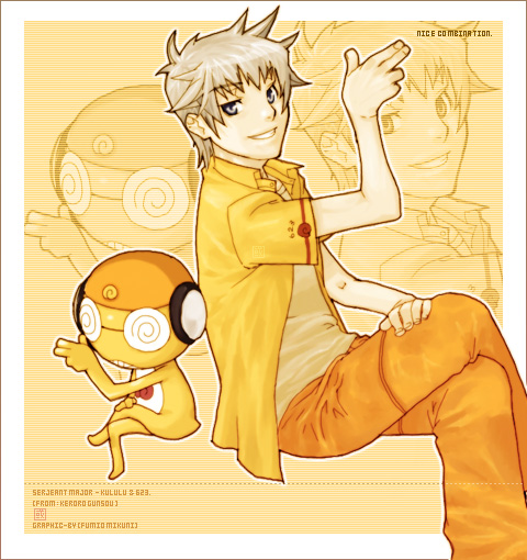 1boy :d back-to-back blonde_hair border crossed_legs fumio_mikuni green_eyes grin jacket keroro_gunsou kururu_(keroro_gunsou) looking_at_viewer md5_mismatch open_mouth orange_pants pants saburo_mutsumi shirt simple_background smile teeth white_border yellow_background yellow_jacket yellow_shirt yellow_theme zoom_layer