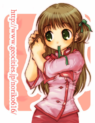 00s 1girl azusagawa_tsukino blush brown_hair female_focus green_eyes hair_ribbon hairdressing long_hair mouth_hold noriko_(artist) noriko_(pandora) pink_shirt ribbon shirt solo standing yakitate!!_japan