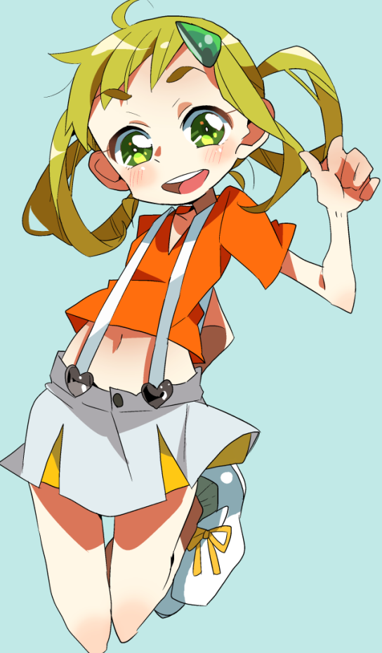 1girl asuka_momoko blonde_hair blush crop_top crop_top_overhang female_focus green_eyes hair_rings midriff navel ojamajo_doremi shoes skirt smile solo sunameri_oishii thigh_gap
