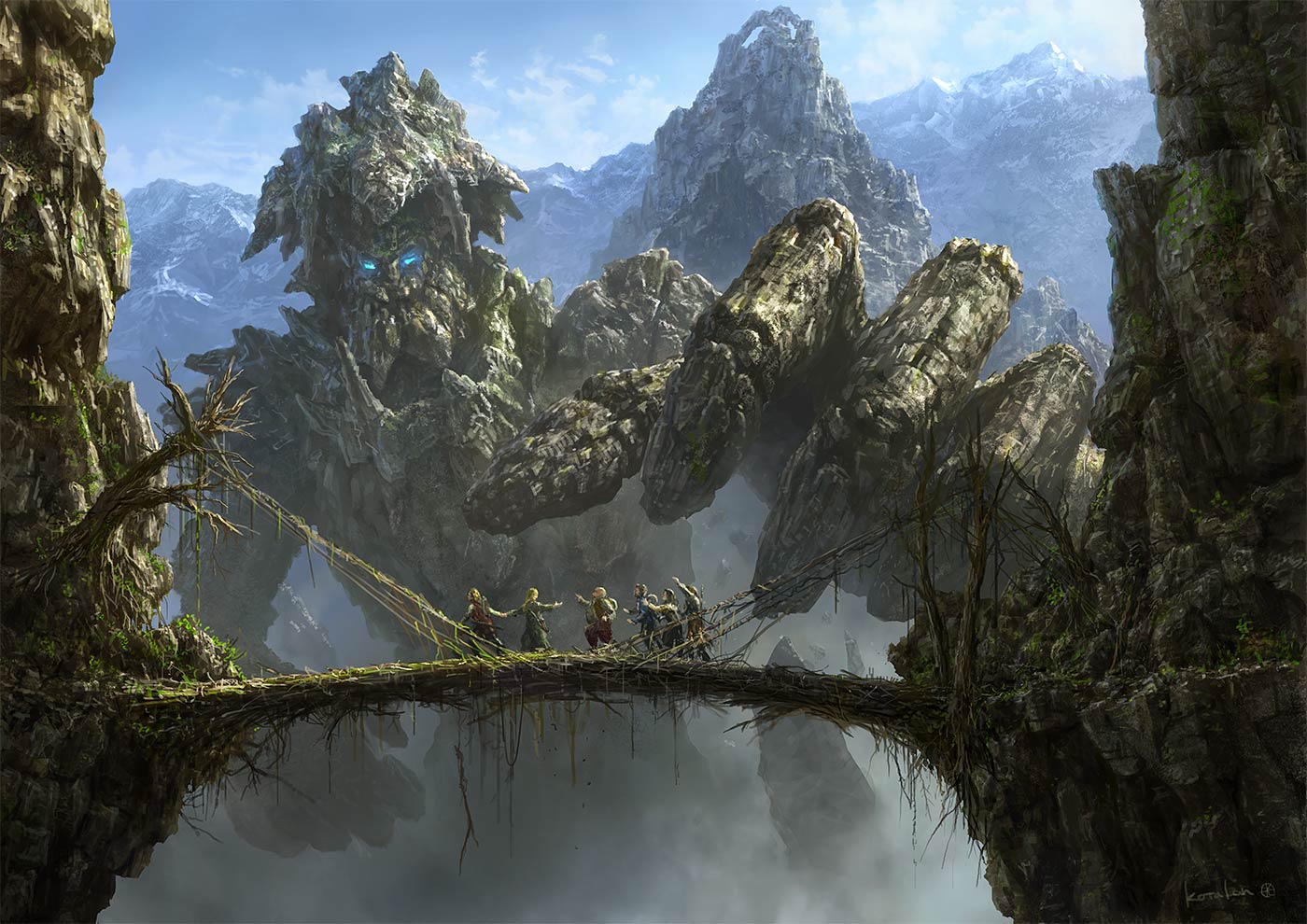 1girl 5boys bridge cloud day fantasy fog giant glowing glowing_eyes golem grand_scale k-takano monster mountain multiple_boys original signature sky tree