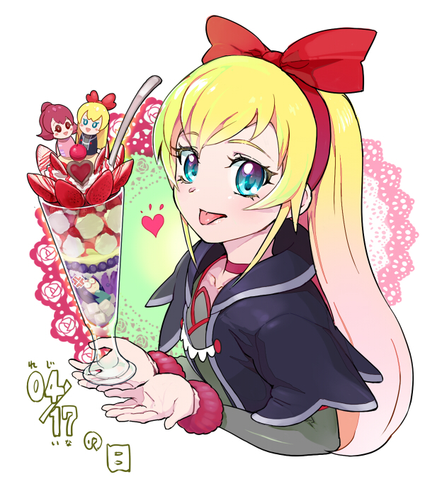 1girl :p aida_mana black_jacket blonde_hair blue_eyes blush cupping_hands dated dessert dokidoki!_precure dress eyelashes female_focus food fruit hair_ornament hair_ribbon heart ice_cream jacket long_hair moudoku_(decopon3rd) own_hands_together precure red_ribbon regina_(precure) ribbon solo strawberry tongue tongue_out translation_request