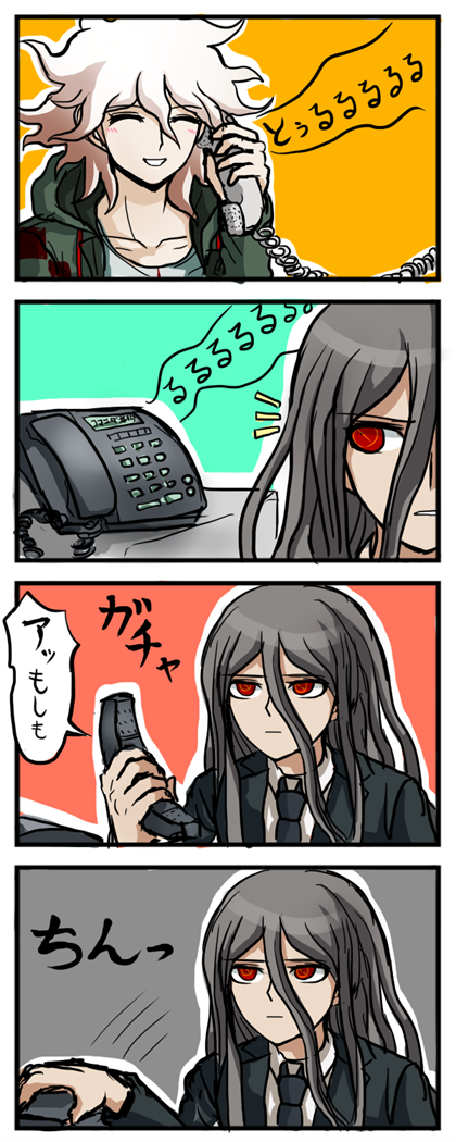 10s 2boys 4koma ^_^ black_hair closed_eyes comic completely_unamused danganronpa_(series) danganronpa_2:_goodbye_despair kamukura_izuru komaeda_nagito long_hair male_focus multiple_boys phone red_eyes spoilers tezurumozuru translation_request tuxedo unamused very_long_hair white_hair