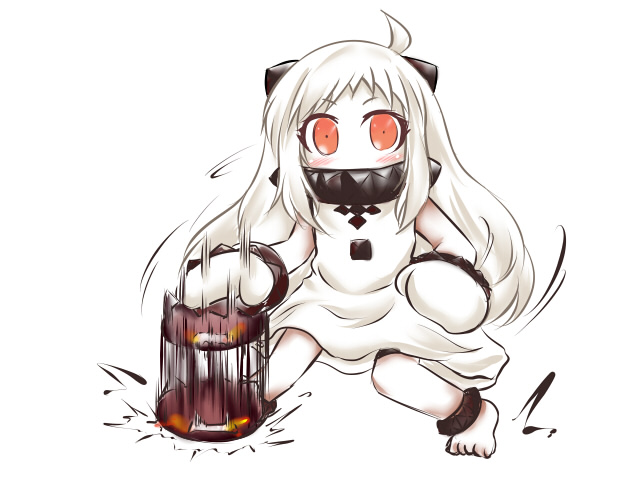 10s 1girl abyssal_ship ahoge ball basketball basketball_(object) colored_skin covered_mouth dress dribbling_(basketball) female_focus horns kantai_collection long_hair looking_at_viewer mittens northern_ocean_princess ouno_(nounai_disintegration) playing_sports red_eyes simple_background sketch solo white_background white_dress white_hair white_skin