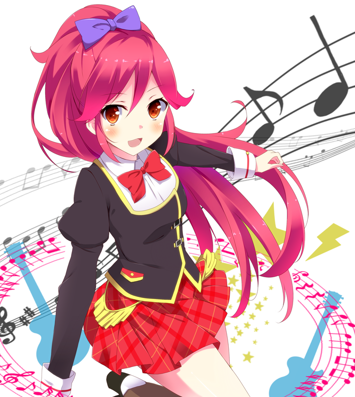 10s 1girl aikatsu! aikatsu!_(series) bad_id bad_pixiv_id bow female_focus hair_bow juliet_sleeves kurono_yuzuko long_hair long_sleeves musical_note open_mouth otoshiro_seira pink_hair ponytail puffy_sleeves red_eyes school_uniform shirt skirt smile solo very_long_hair