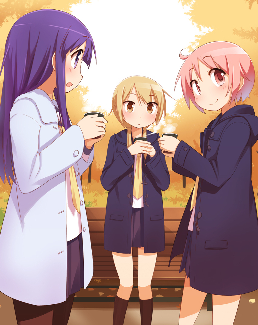 3girls autumn baakurou black_legwear blonde_hair blush coat cup hinata_yukari ichii_yui long_hair multiple_girls nonohara_yuzuko open_mouth pantyhose pink_hair purple_eyes purple_hair school_uniform serafuku short_hair skirt smile steam tree twintails yellow_eyes yuyushiki