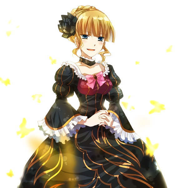 00s 1girl beatrice_(umineko) bell_line_gown black_dress blonde_hair blue_eyes bow choker dress fang female_focus frills gown interlocked_fingers leotard open_mouth puffy_sleeves ribbon short_hair smile solo suzushiro_kurumi umineko_no_naku_koro_ni white_background