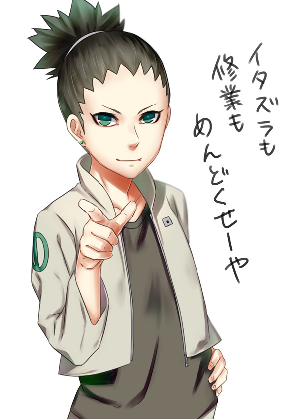 1boy black_hair blue_eyes hand_on_own_hip jacket looking_at_viewer male_focus nara_shikadai naruto_(classic) naruto_(series) pointing pointing_at_viewer solo tetta_(tetta03) white_background