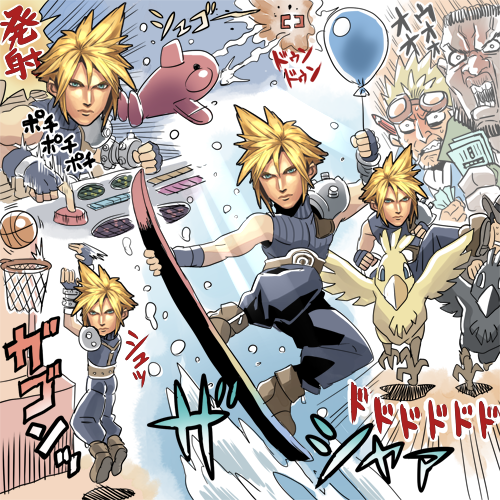 1990s_(style) 4boys angry ball balloon barret_wallace basketball basketball_(object) chocobo cid_highwind cloud_strife final_fantasy final_fantasy_vii gameplay_mechanics gold_saucer joe_(ff7) lowres male_focus mimonel multiple_boys object_behind_ear pencil pencil_behind_ear playing_sports retro_artstyle serious snowboard submarine touhou_fuhai watercraft what