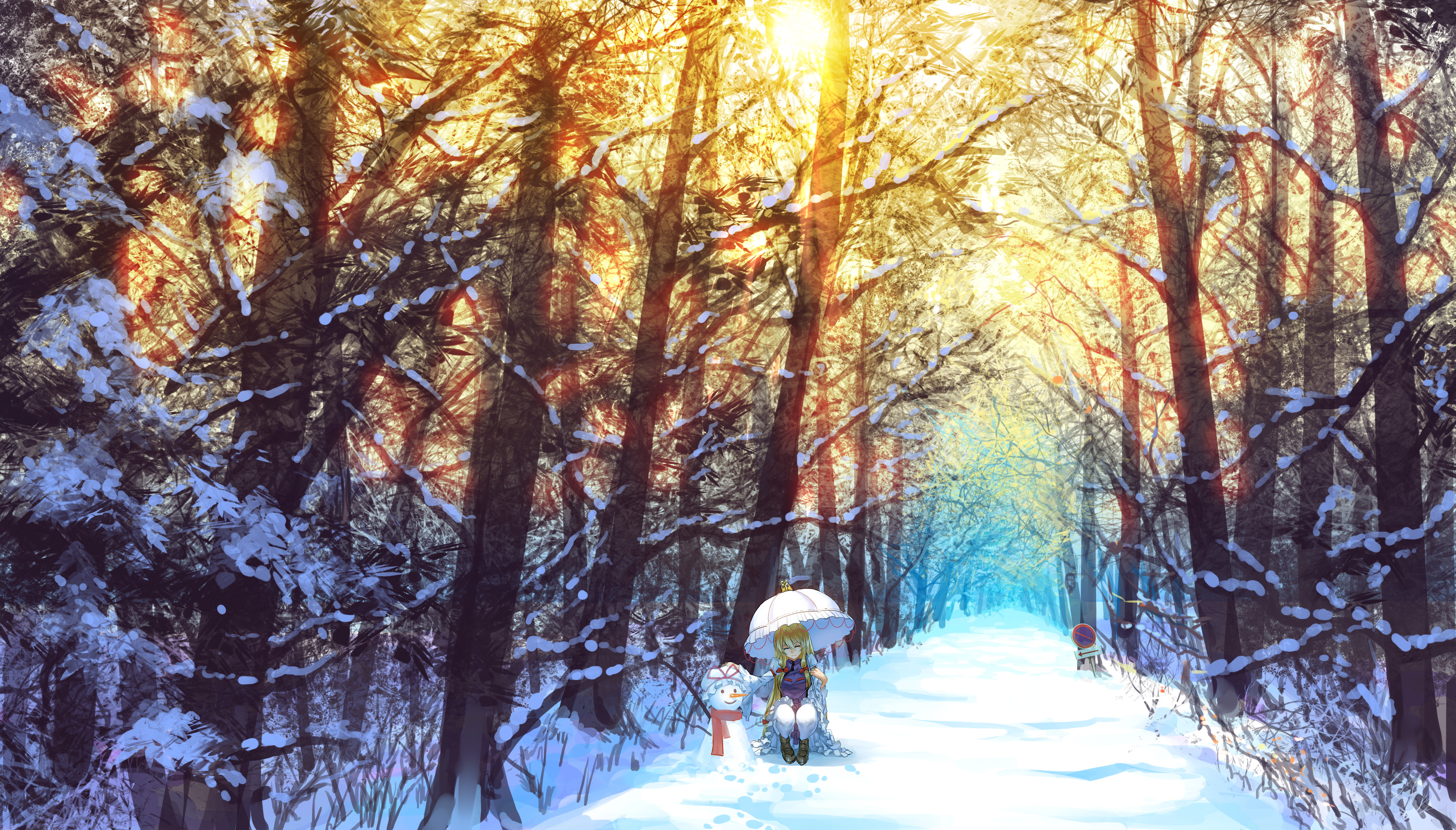 1girl absurdres blonde_hair closed_eyes dress female_focus forest hair_ribbon hat hat_ribbon highres madcocoon mob_cap nature parasol path ribbon road road_sign scarf scenery sign smile snow snowman solo squatting sun sunlight tabard touhou tress_ribbon umbrella unworn_hat unworn_headwear vanishing_point white_dress winter yakumo_yukari