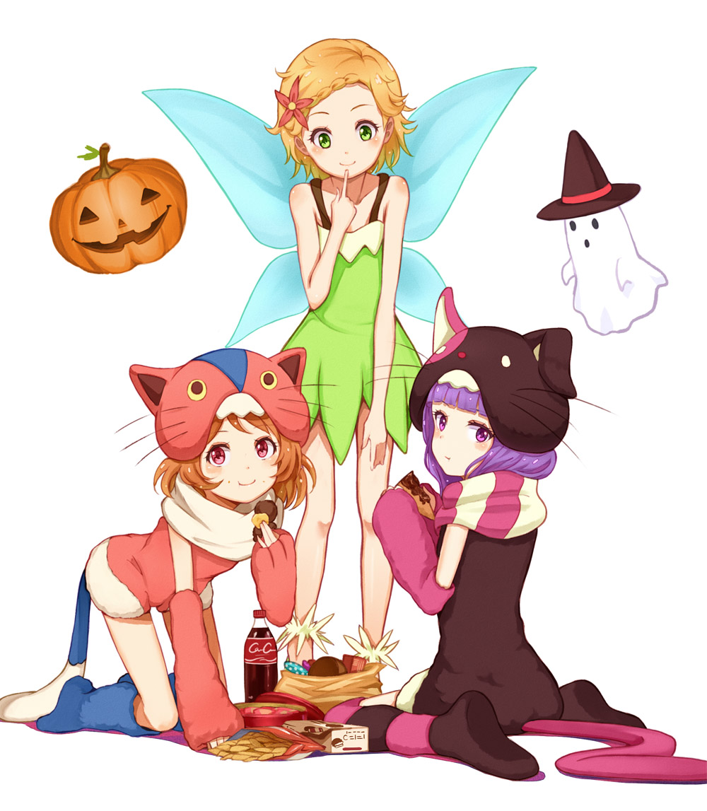 3girls aikatsu! aikatsu!_(series) animal_costume animal_hood blonde_hair blush bottle brown_hair cat_costume cat_hood coca-cola cosplay dress eating fairy_wings flower ghost green_eyes hair_flower hair_ornament hair_ribbon halloween hat hikami_sumire hood jack-o'-lantern long_hair looking_at_viewer multiple_girls one_side_up ozora_akari pumpkin purea purple_eyes purple_hair red_eyes ribbon scarf shinjo_hinaki short_hair sitting smile soda_bottle tail tinker_bell_(disney) tinker_bell_(disney)_(cosplay) walt_disney's_peter_pan wariza wings