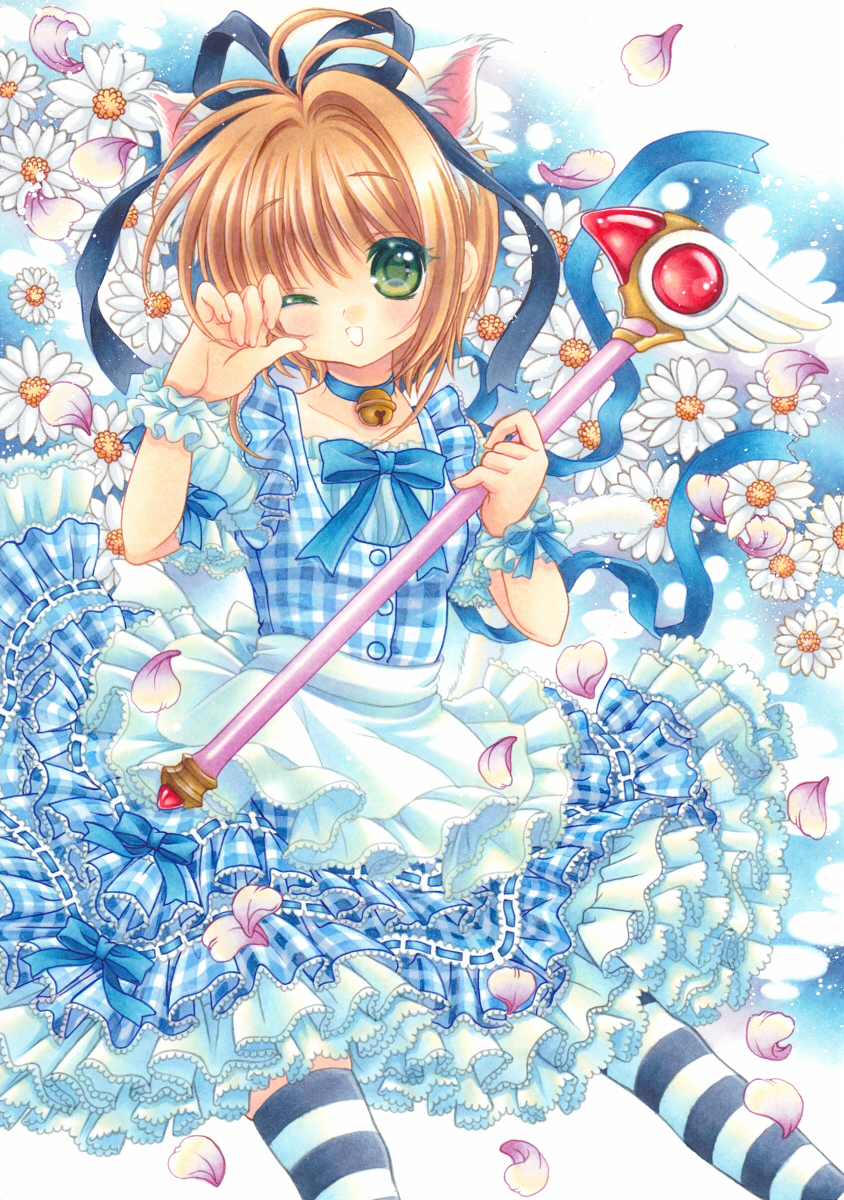 1990s_(style) 1girl animal_ears bell blue_dress bow brown_hair cardcaptor_sakura cat_ears choker dress female_focus flower frills fuuin_no_tsue green_eyes hair_intakes hair_ribbon highres jingle_bell kemonomimi_mode kinomoto_sakura kirio_mari neck_bell one_eye_closed petals plaid_clothes plaid_dress retro_artstyle ribbon short_hair solo striped_clothes striped_thighhighs thighhighs wand wrist_cuffs