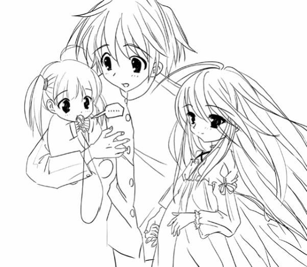 00s 1boy 2girls ahoge alastor_(shakugan_no_shana) buttons child eating family father_and_child father_and_daughter gakuran greyscale holding if_they_mated jewelry long_hair long_sleeves monochrome mother_and_child mother_and_daughter multiple_girls parent_and_child pendant pregnant sakai_yuuji school_uniform shakugan_no_shana shana simple_background upper_body very_long_hair white_background