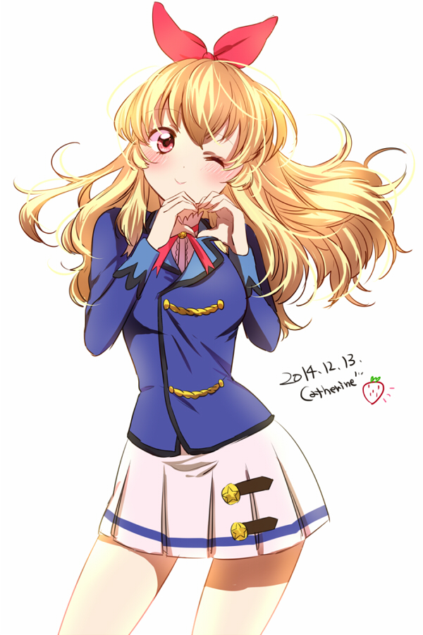 10s 1girl 2014 ;) aikatsu! aikatsu!_(series) bad_id bad_pixiv_id blonde_hair dated female_focus heart heart_hands hoshimiya_ichigo long_hair one_eye_closed pink_eyes play_r school_uniform simple_background skirt smile solo white_background white_skirt
