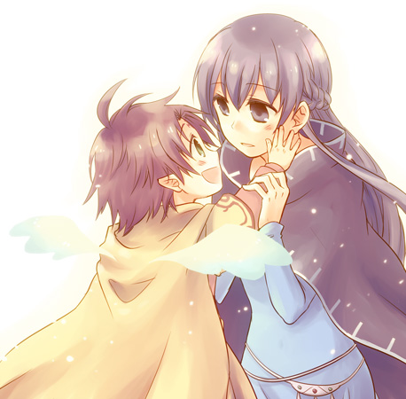 2girls belly_chain blue_dress blush cape cloak dress eye_contact fae_(fire_emblem) female_focus fire_emblem fire_emblem:_the_binding_blade green_eyes hand_on_another's_arm hand_on_another's_arms hand_on_another's_face jewelry long_hair looking_at_another lowres multiple_girls nintendo open_mouth pink_hair pointy_ears purple_eyes purple_hair serina_ranshi short_hair simple_background smile sophia_(fire_emblem) very_long_hair white_background wings