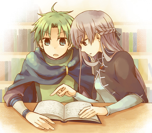 1boy 1girl blue_eyes book bookshelf cape dress fire_emblem fire_emblem:_the_binding_blade green_hair hair_ribbon hand_on_table jewelry long_hair nintendo open_book open_mouth purple_eyes purple_hair raigh_(fire_emblem) ribbon serina_ranshi short_hair sophia_(fire_emblem) very_long_hair