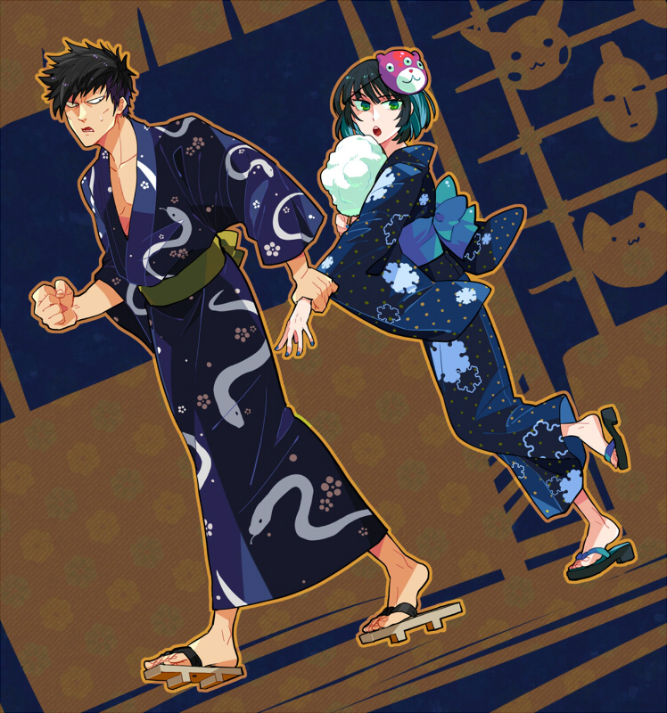 1boy 1girl black_eyes black_hair fubuki_(one-punch_man) green_eyes height_difference holding_another's_arm holding_another's_wrist hand_on_own_arm japanese_clothes kimono mask matatabi_nia one-punch_man sandals snake_(one-punch_man)