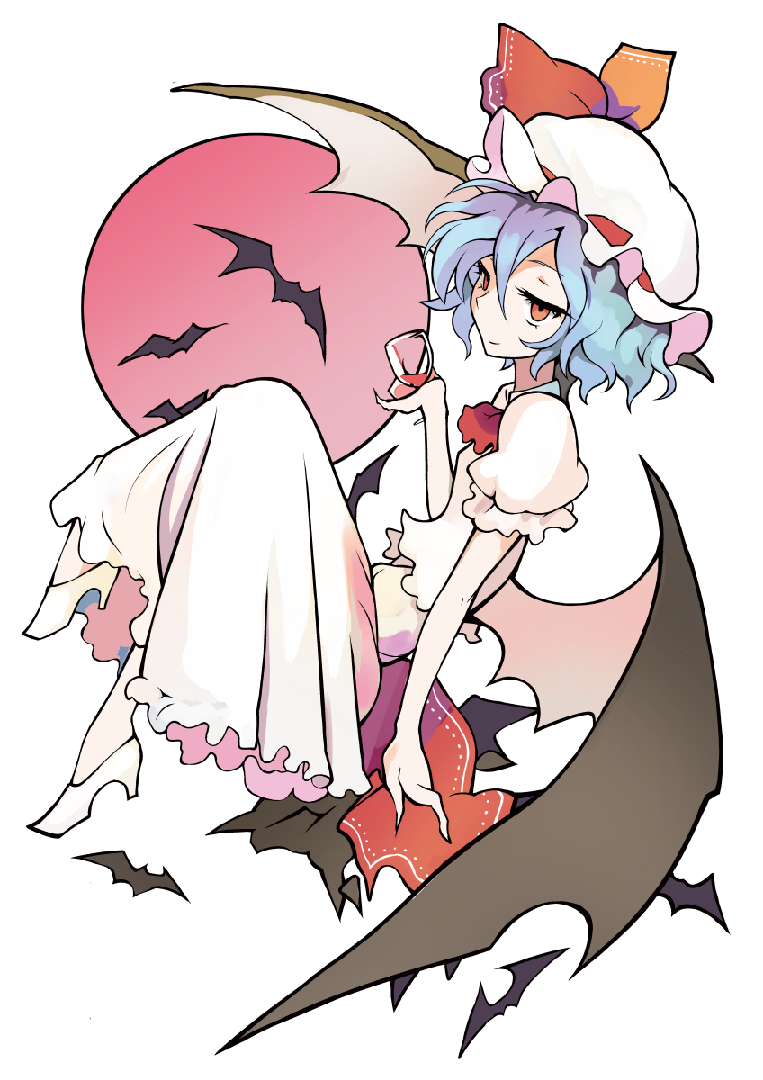 1girl bat_(animal) bat_wings blue_hair bow cup dress drinking_glass female_focus hat hat_bow high_heels highres moon red_eyes red_moon remilia_scarlet simple_background solo touhou wine_glass wings yuugiri_(u-slash)