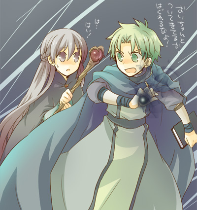 1boy 1girl blue_background blue_eyes blush book cape cloak confused embarrassed fire_emblem fire_emblem:_the_binding_blade green_hair holding holding_book long_hair looking_at_another looking_back lowres mage_staff magic nintendo open_mouth purple_eyes purple_hair raigh_(fire_emblem) robe serina_ranshi simple_background sophia_(fire_emblem) staff translation_request very_long_hair