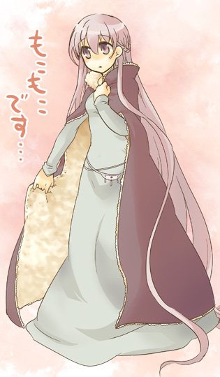 1girl absurdly_long_hair belly_chain blue_dress cloak dress female_focus fire_emblem fire_emblem:_the_binding_blade full_body jewelry long_hair nintendo purple_background purple_eyes purple_hair serina_ranshi simple_background solo sophia_(fire_emblem) translation_request very_long_hair