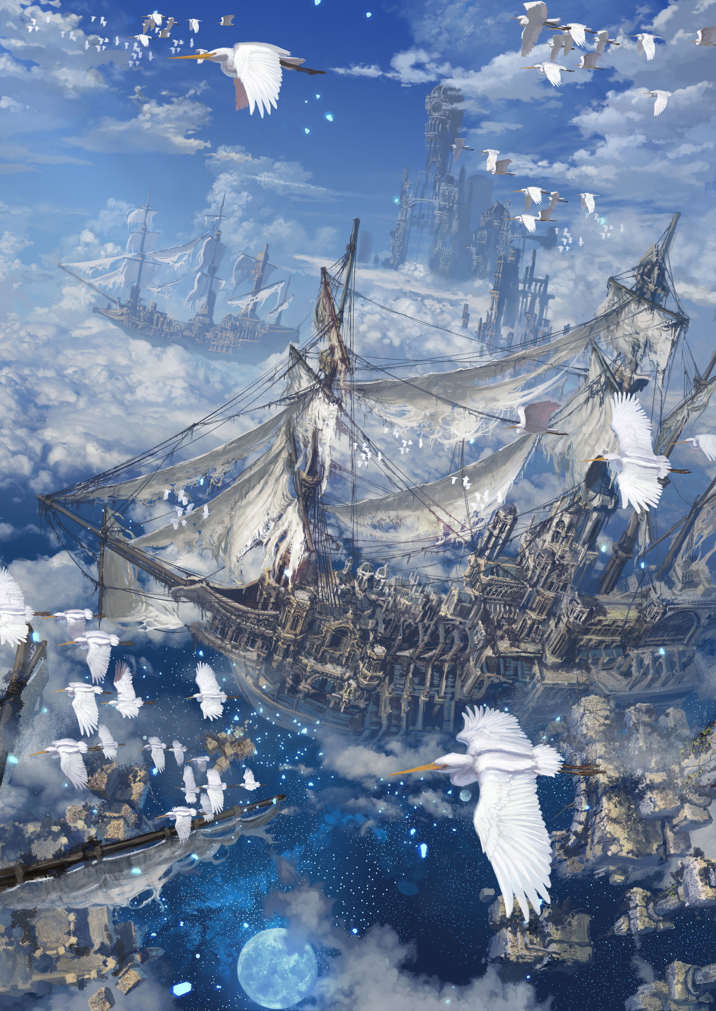 absurdres bird boat cloud fantasy full_moon highres moon no_humans original reishin_(tenpurasoba) scenery sky star_(sky) watercraft