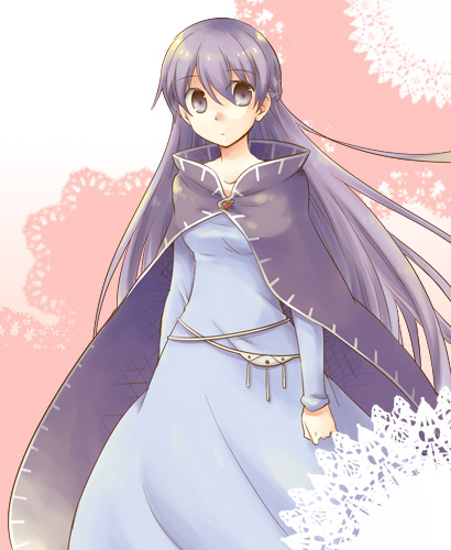1girl belly_chain blue_dress cloak dress female_focus fire_emblem fire_emblem:_the_binding_blade jewelry long_hair looking_at_viewer lowres nintendo purple_eyes purple_hair serina_ranshi simple_background solo sophia_(fire_emblem) very_long_hair