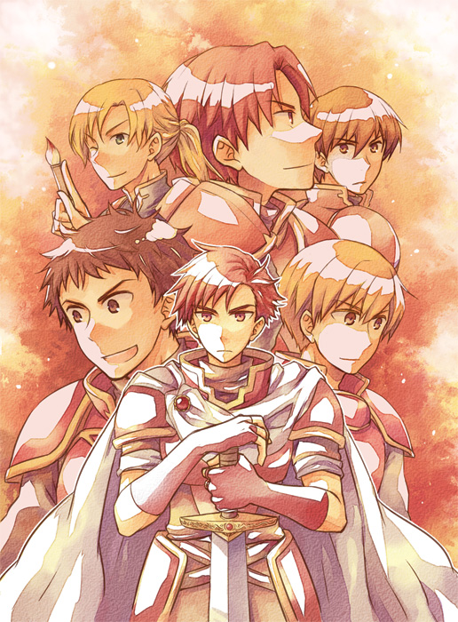 6+boys ;) alen_(fire_emblem) armor blonde_hair brown_eyes brown_hair cain_(fire_emblem:_shadow_dragon) cape fiery_background fingerless_gloves fire fire_emblem fire_emblem:_genealogy_of_the_holy_war fire_emblem:_mystery_of_the_emblem fire_emblem:_path_of_radiance fire_emblem:_shadow_dragon_and_the_blade_of_light fire_emblem:_the_binding_blade fire_emblem:_the_blazing_blade fire_emblem:_the_sacred_stones forde_(fire_emblem) gloves kent_(fire_emblem) kieran_(fire_emblem) knight looking_away male_focus multiple_boys naoise_(fire_emblem) nintendo one_eye_closed open_mouth orange_eyes orange_hair red_eyes red_gloves red_hair serina_ranshi serious smile sword trait_connection weapon