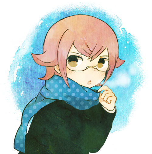 10s 1boy ayu_(mog) bad_id bad_pixiv_id blue_background glasses inazuma_eleven_(series) inazuma_eleven_go inazuma_eleven_go_galaxy male_focus manabe_jin'ichirou open_mouth pink_hair scarf short_hair solo unmoving_pattern upper_body white_background