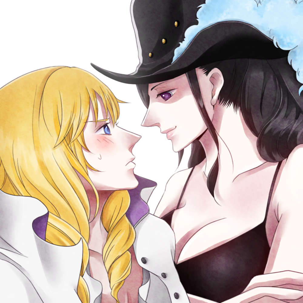 1boy 1girl black_dress black_hair blonde_hair blue_eyes blush breasts cavendish_(one_piece) cleavage dress eye_contact hat long_hair looking_at_another nico_robin nico_robin_(dressrosa) one_piece plume purple_eyes smile yucchan_wakayuri