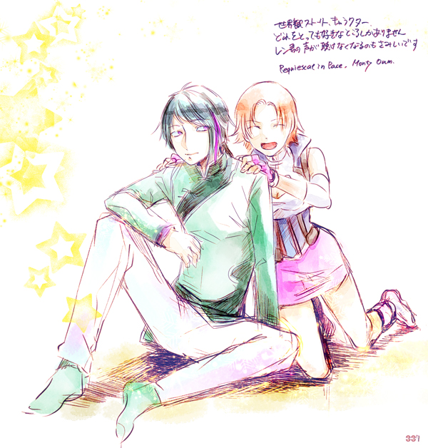 1boy 1girl 337_(337lm) bad_id bad_pixiv_id changpao chinese_clothes closed_eyes hands_on_another's_shoulders latin_text lie_ren monty_oum_(creator) nora_valkyrie open_mouth orange_hair purple_eyes rest_in_peace_(phrase) rwby sitting smile translation_request voice_actor_connection