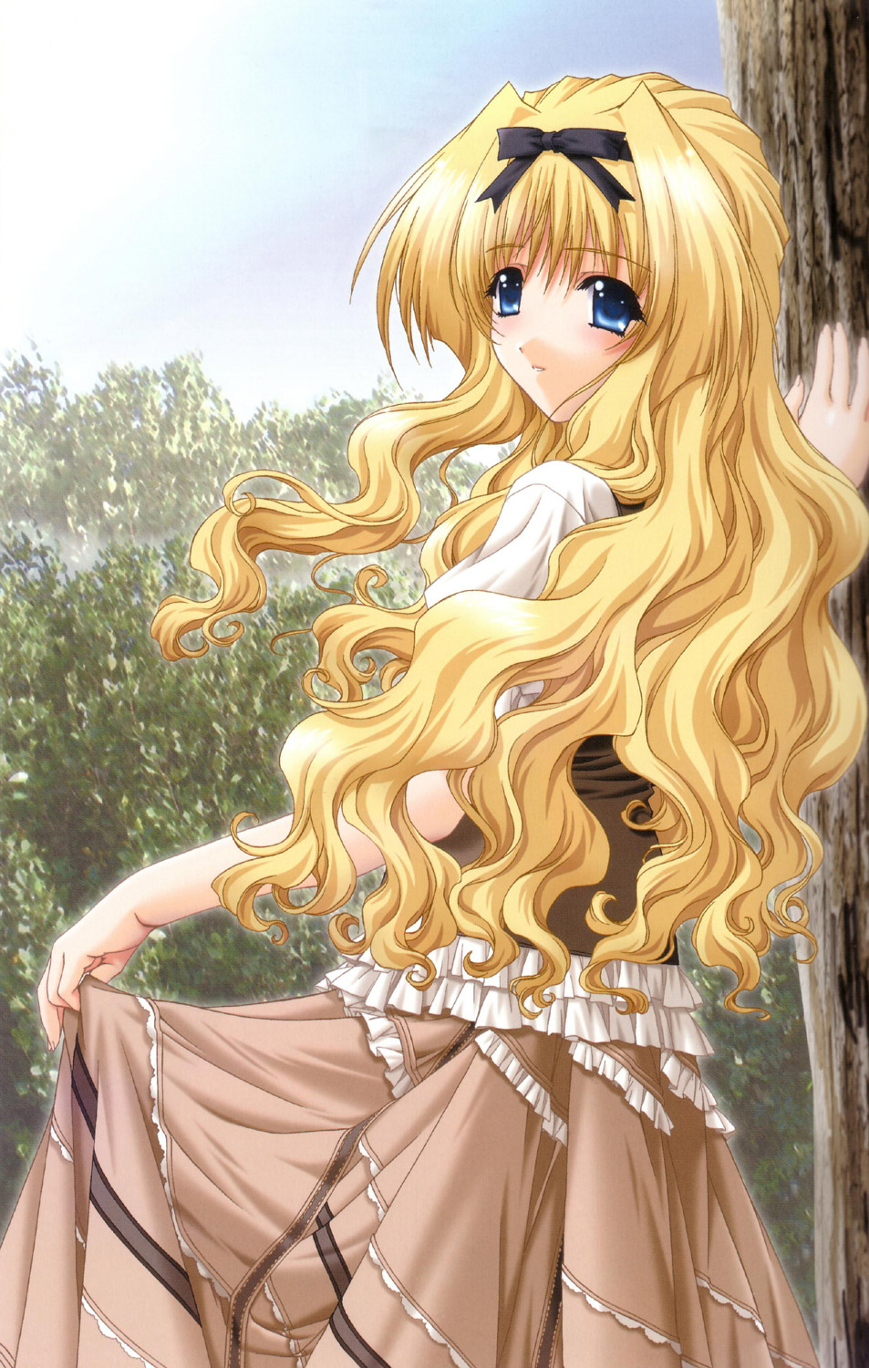 1girl 3ldk blonde_hair blue_eyes day female_focus forest highres kimizuka_aoi kimizuka_aoi_(artist) long_hair nature outdoors sky solo tree yukimura_noel