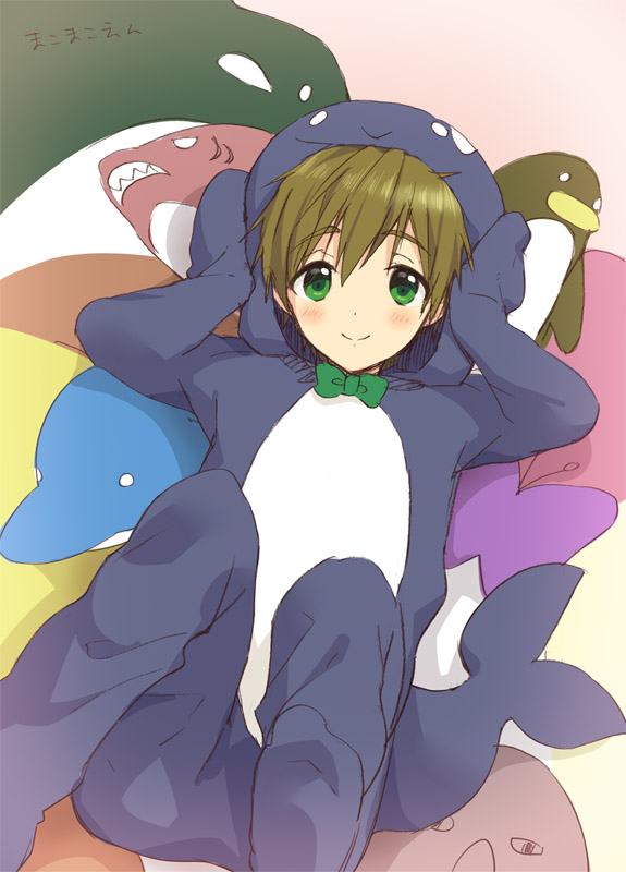 10s 1boy blush bow bowtie brown_hair bug butterfly dolphin free! green_eyes insect iwatobi-chan male_focus mo_(nmnme) multiple_boys open_mouth short_hair smile solo stuffed_animal stuffed_penguin stuffed_shark stuffed_toy tachibana_makoto whale_costume